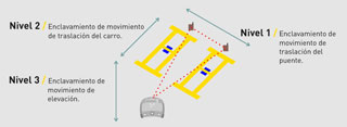 • If any of the movements (lifting, trolley movement, bridge movement) changes between slow speed/fast speed/stop, a signal is sent to the other crane to carry out the same change.